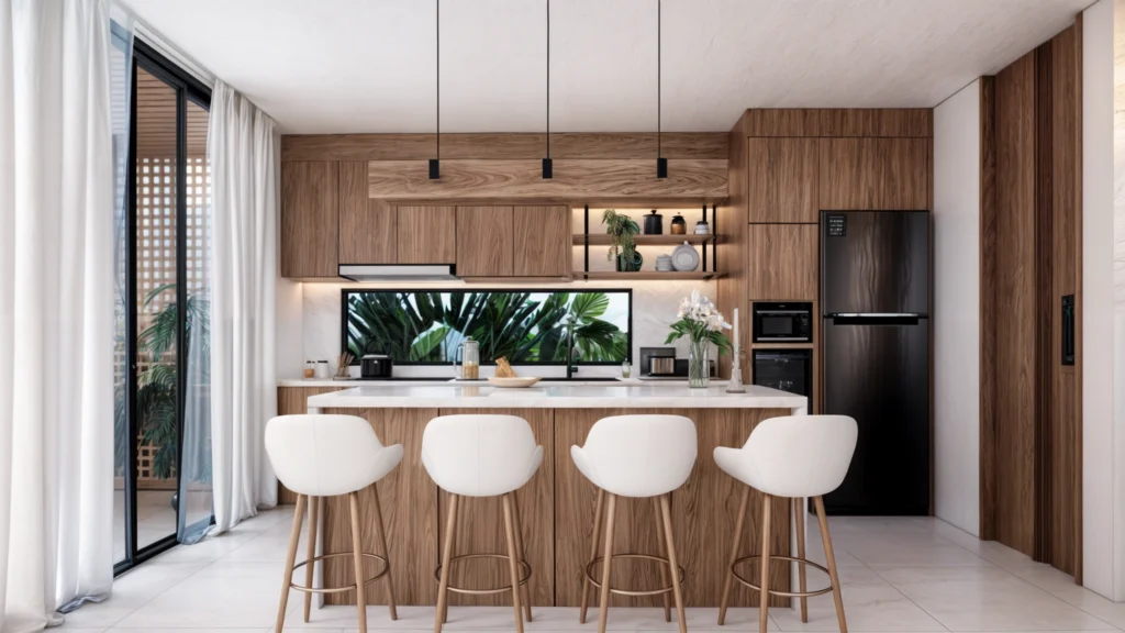 Inside, the open-plan living and dining area is flooded with natural light and flows effortlessly into the fully equipped kitchen. Large sliding glass doors open to your own private pool and tropical garden, blurring the lines between indoor and outdoor living. Each bedroom offers spacious layouts, built-in wardrobes, and an ensuite bathroom for privacy and convenience.