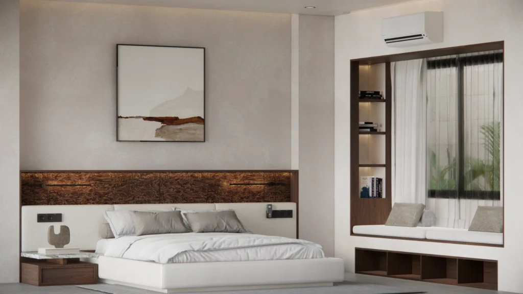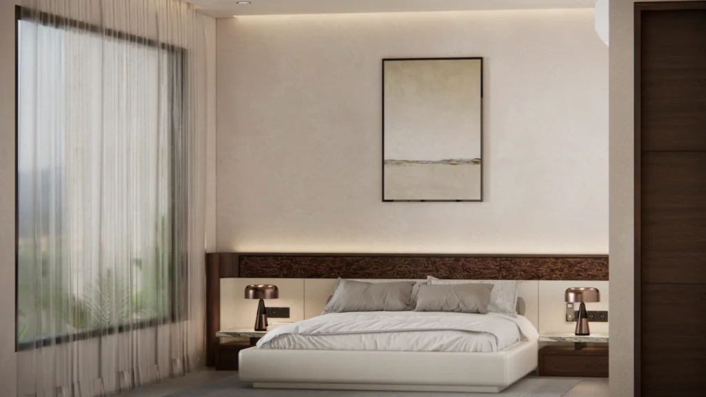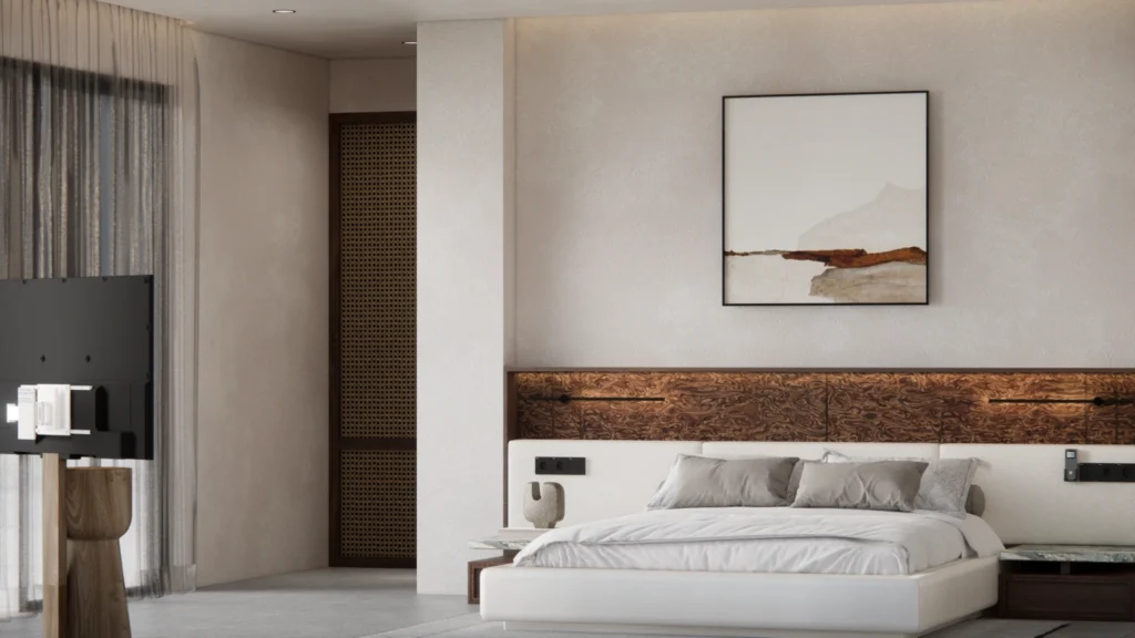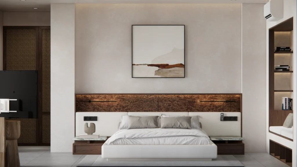Delicate shades of ivory on walls and furnishings blend seamlessly with young timber details on chairs, built ins, and finishes, creating a space that feels both youthful and serene. The minimalist layout allows each element to shine in its honesty, free from noise or clutter.