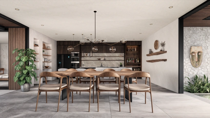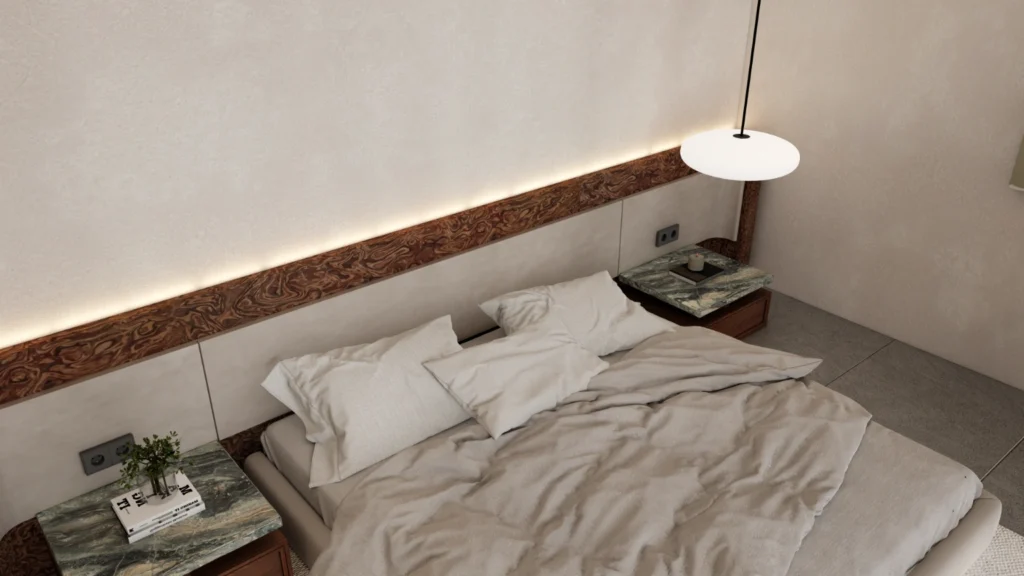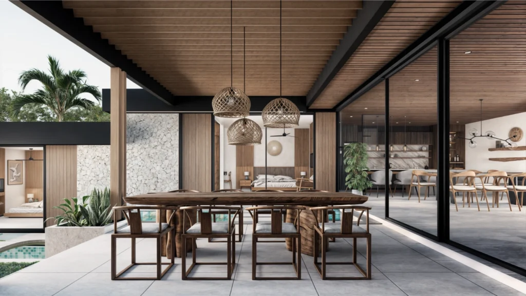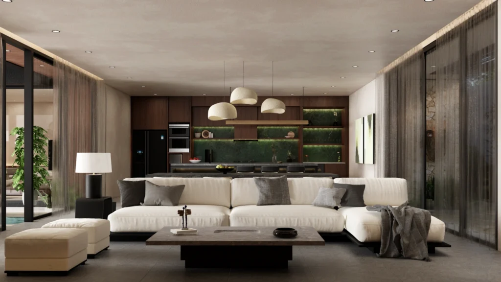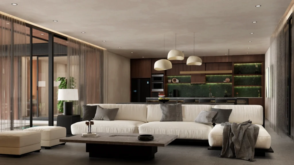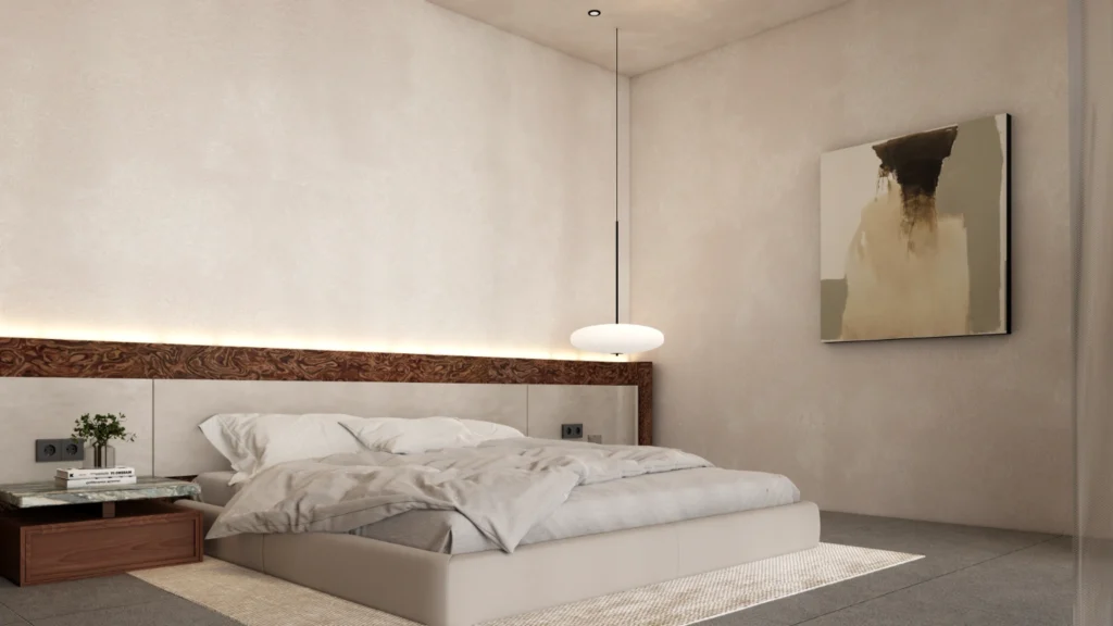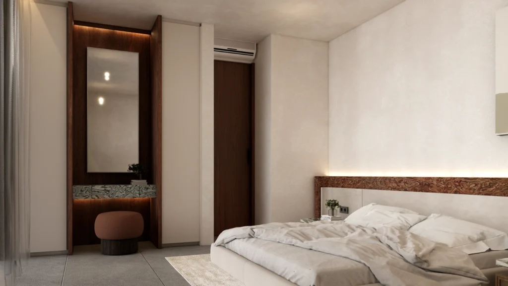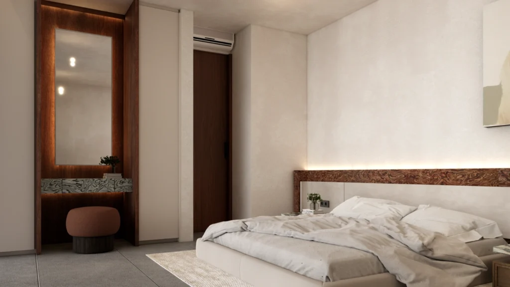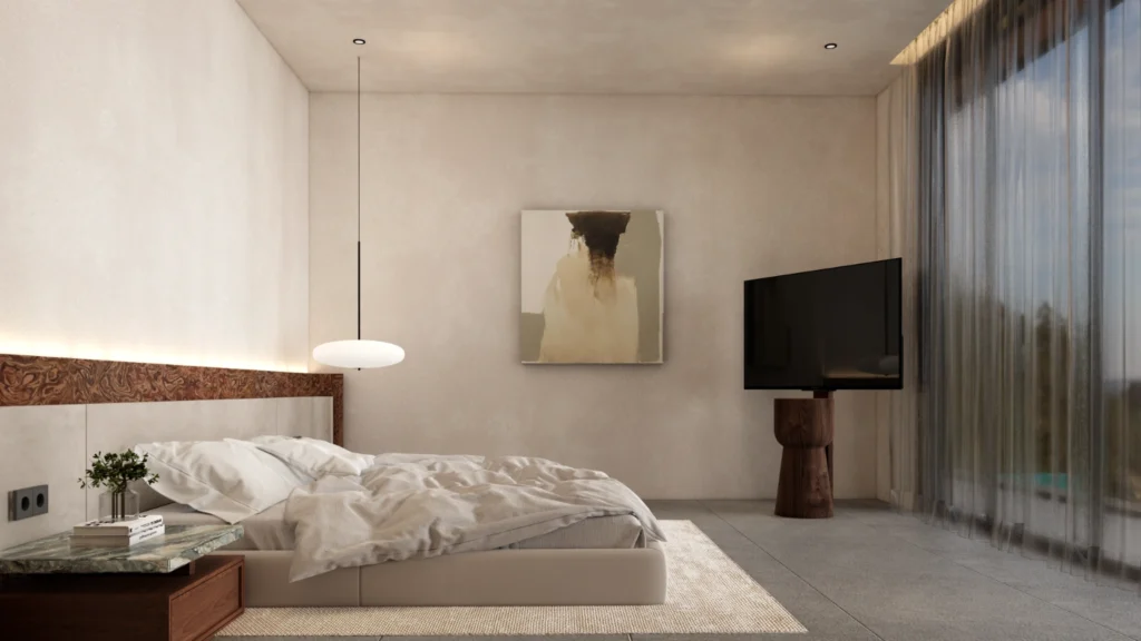 Thoughtful contrasts between pale woods, warm creams, and a whisper of smoky black give the villa dimension while keeping the atmosphere light and soothing. It’s a space that doesn’t shout, but whispers calm, warmth, and emotional clarity.